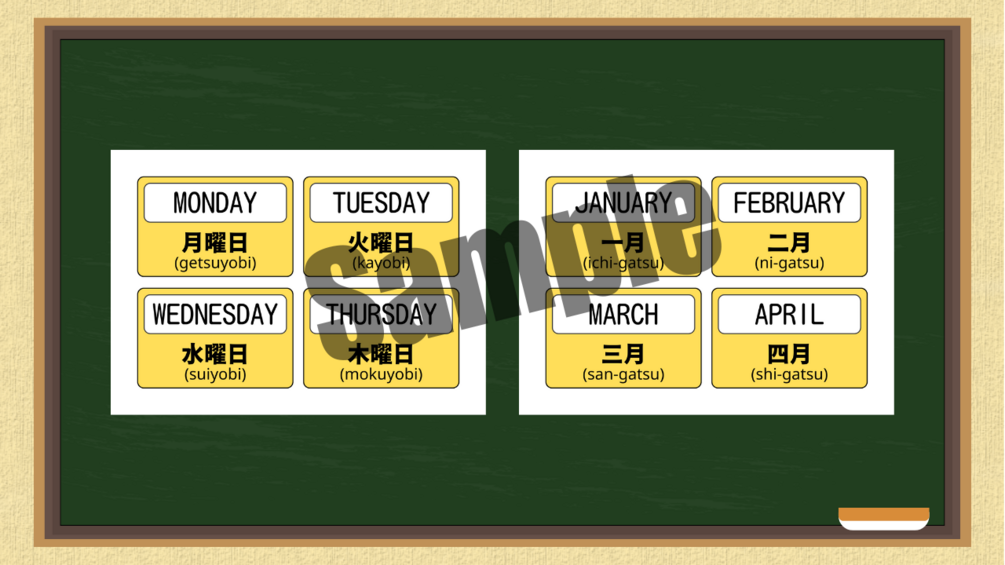 PDF print ready flashcards featuring days of the week and months in a year in Japanese, comes with kanji and romaji typing.