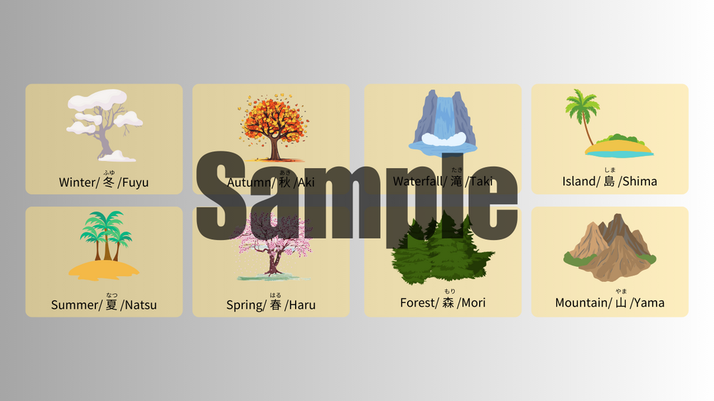 Japanese flashcards for basic learning about the four seasons and a little of basic geography and science. Direct translations of the kanji symbol with furigana above to guide readers.
